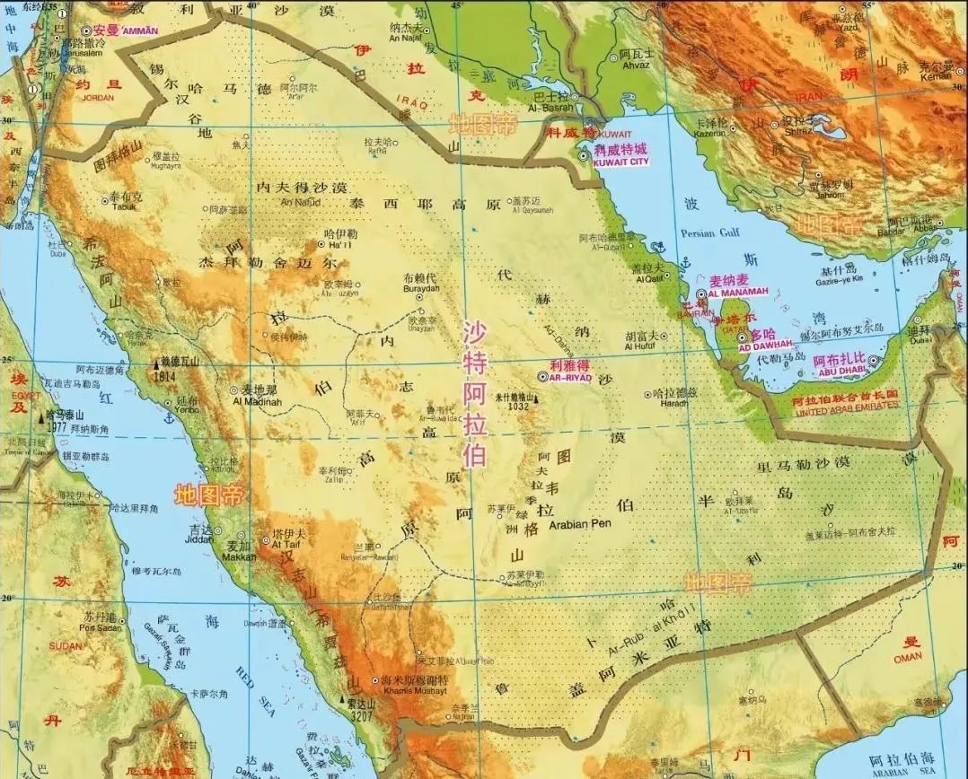 沙特全称沙特阿拉伯王国,位于亚欧大陆西部的阿拉伯半岛,东说念主口有3200多万。由于身处非凡的地舆位置,沙特莫得沿海国度那般领有先天不足的时局,其70%的面积为沙漠、萧疏,年平均降雨不及200毫米。